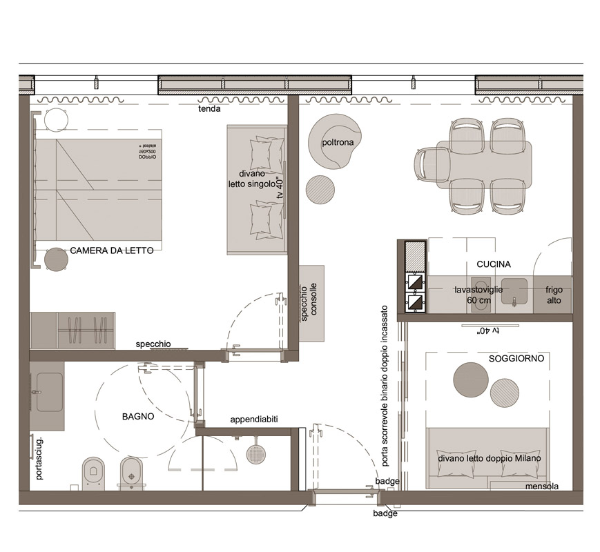 1 ložnice s manželskou postelí oddělená od obývací části posuvnou stěnou, obývací pokoj s kuchyňským koutem a rozkládacím gaučem pro 1 či 2 osoby, sociální zařízení se sprchou