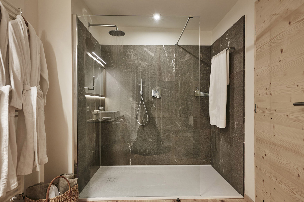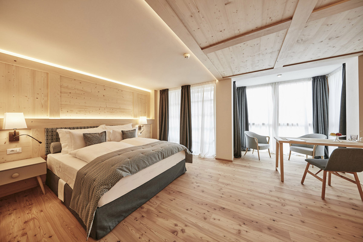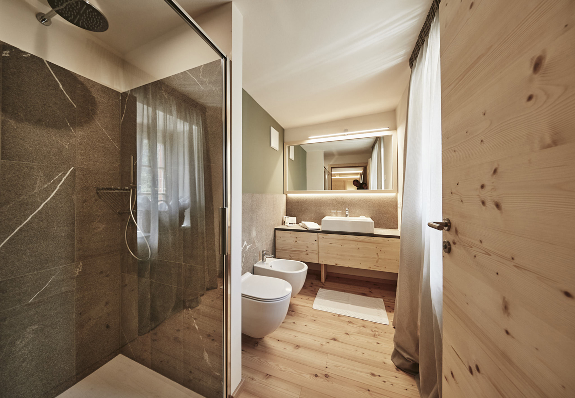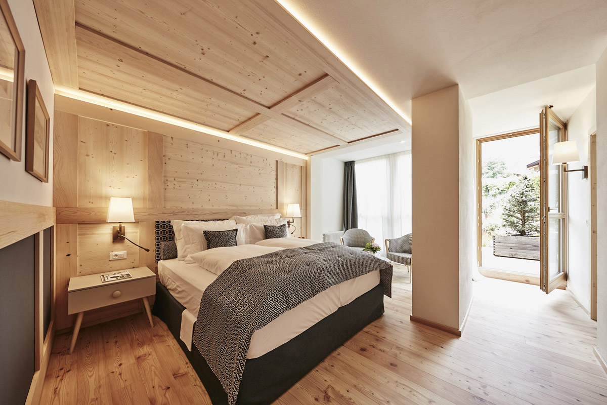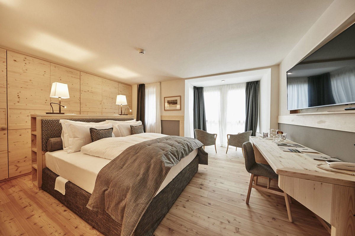 TV sat., telefon, fén, trezor, wi-fi připojení k internetu, minibar, jablka z oblasti Val Venosta, termofor, psací stůl, župany a pantofle do wellness, kosmetika Glacisse