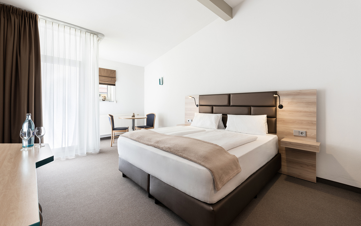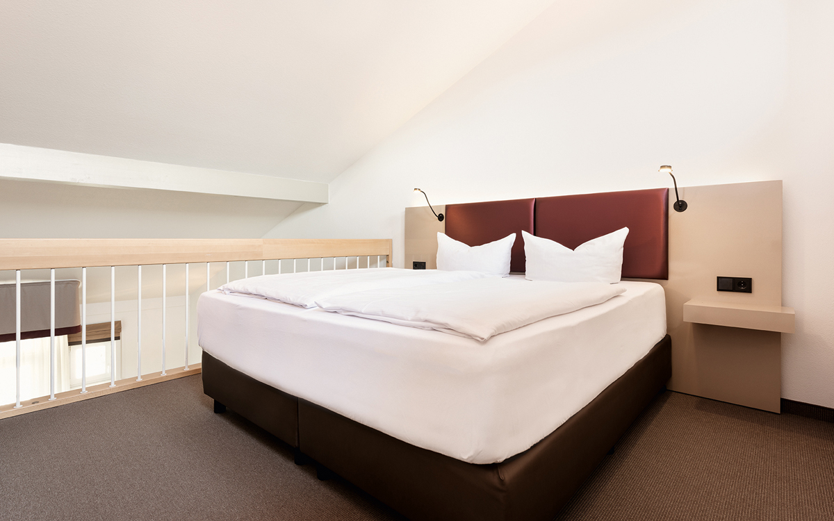 25 až 30 m² - pokoj s manželskou postelí a případně rozkladacím gaučem či přistýlkou pro 1 dítě do nedovršených 15 let, sociální zařízení se sprchou či vanou; pokoje leží v hlavní budově