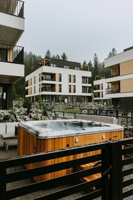 zcela nový resort tvořící 9 samostatných budov se 125 komfortními apartmány vysokého standardu, rekreační areál v srdci Chráněné krajinné oblasti Slezské Beskydy