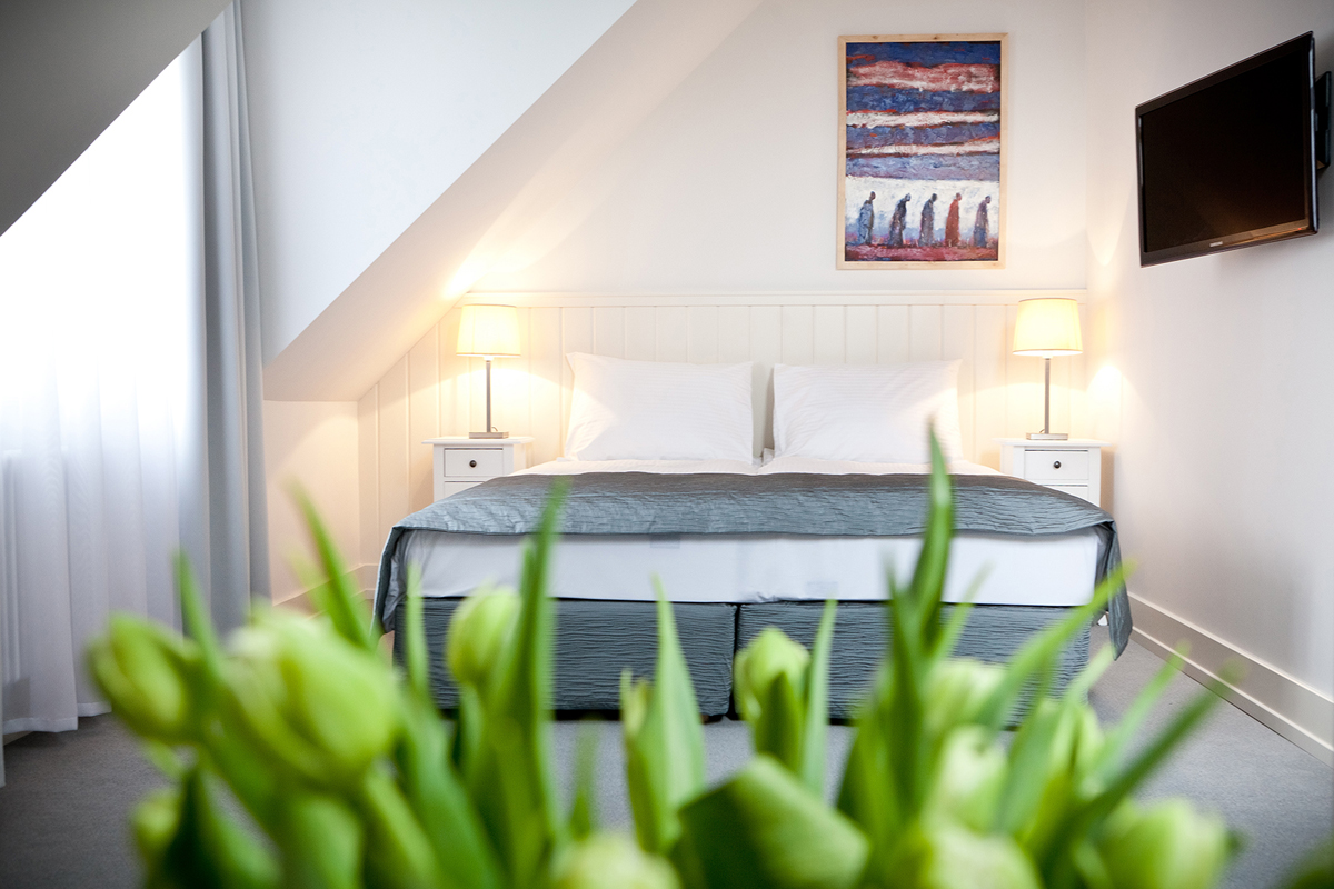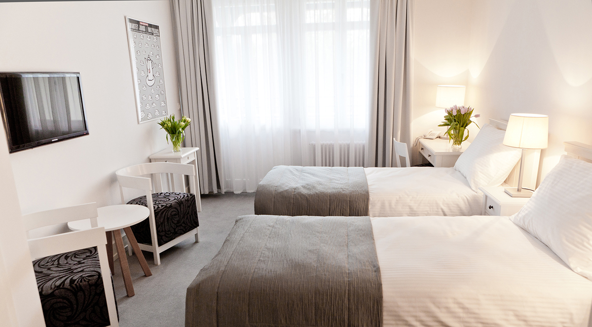 pokoj s manželskou postelí či oddělitelnými lůžky, sociální zařízení se sprchou, zpravidla balkon