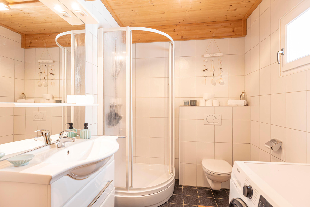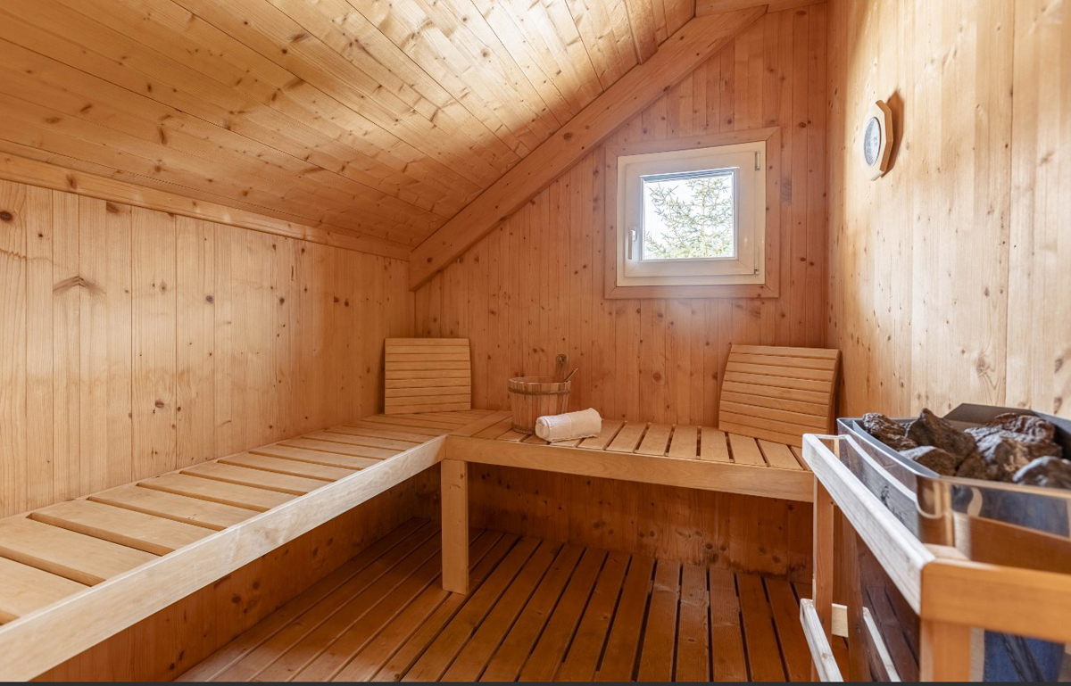 100 m² - 1. podlaží chaletu: obývací pokoj s kuchyňským koutem, samostatné WC, terasa; 2. podlaží chaletu: 1 ložnice s manželskou postelí, 1 ložnice s manželskou postelí a palandou a další ložnice se 2 samostatnými lůžky, 2x sociální zařízení (1x se sprchou a 1x s vanou), privátní sauna, balkon