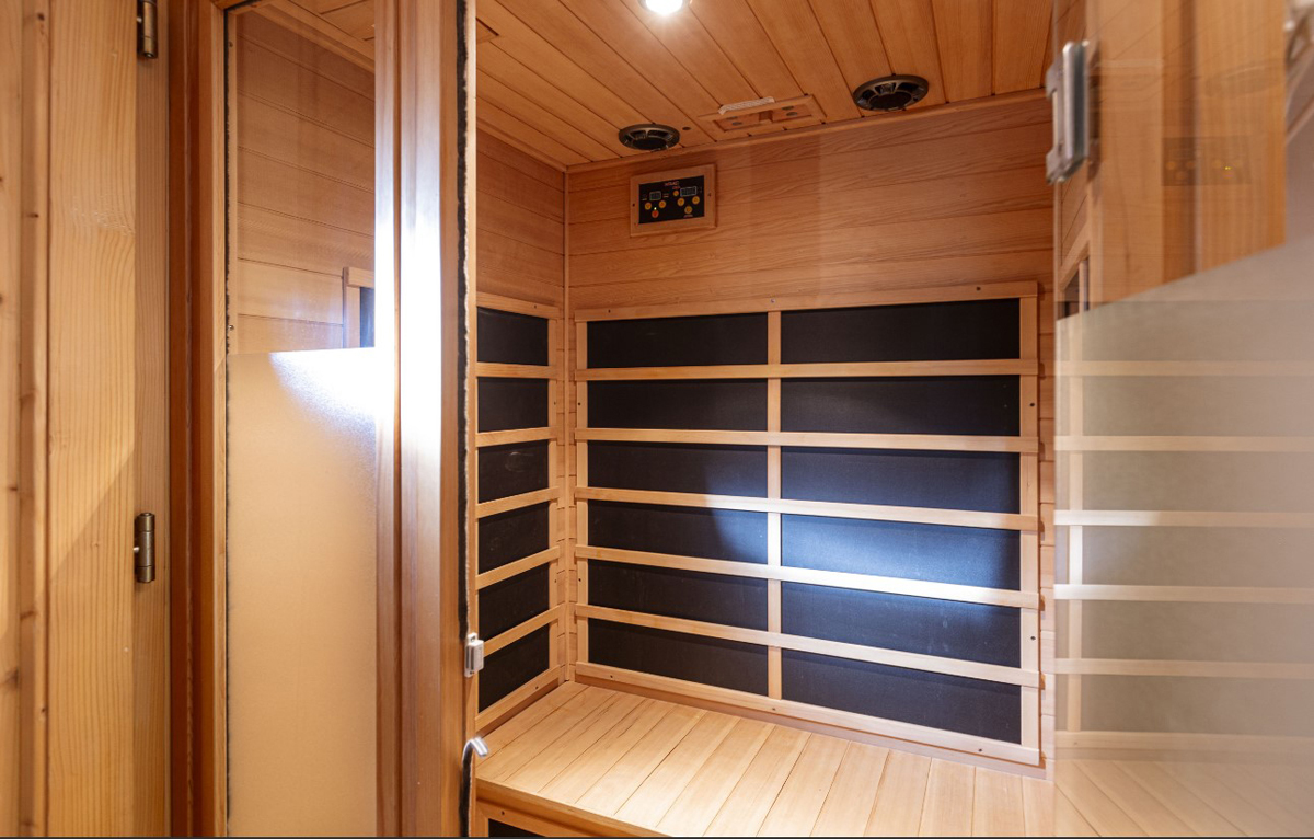 100 m² - 1. podlaží chaletu: obývací pokoj s kuchyňským koutem, terasa; 2. podlaží chaletu: 2 ložnice s manželskou postelí, 2 ložnice se 2 samostatnými lůžky, 2x sociální zařízení (1x se sprchou a privátní infračervenou saunou, 1x s vanou)