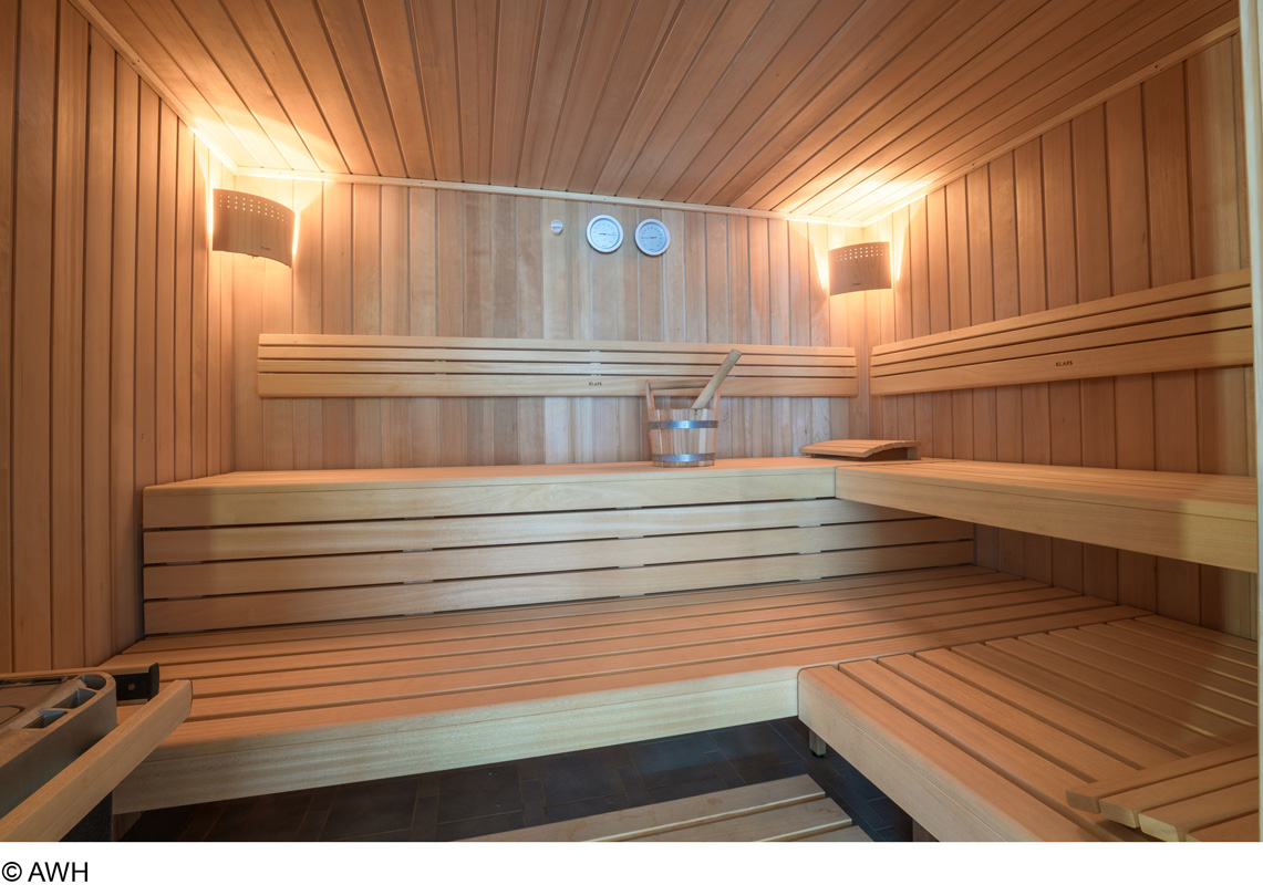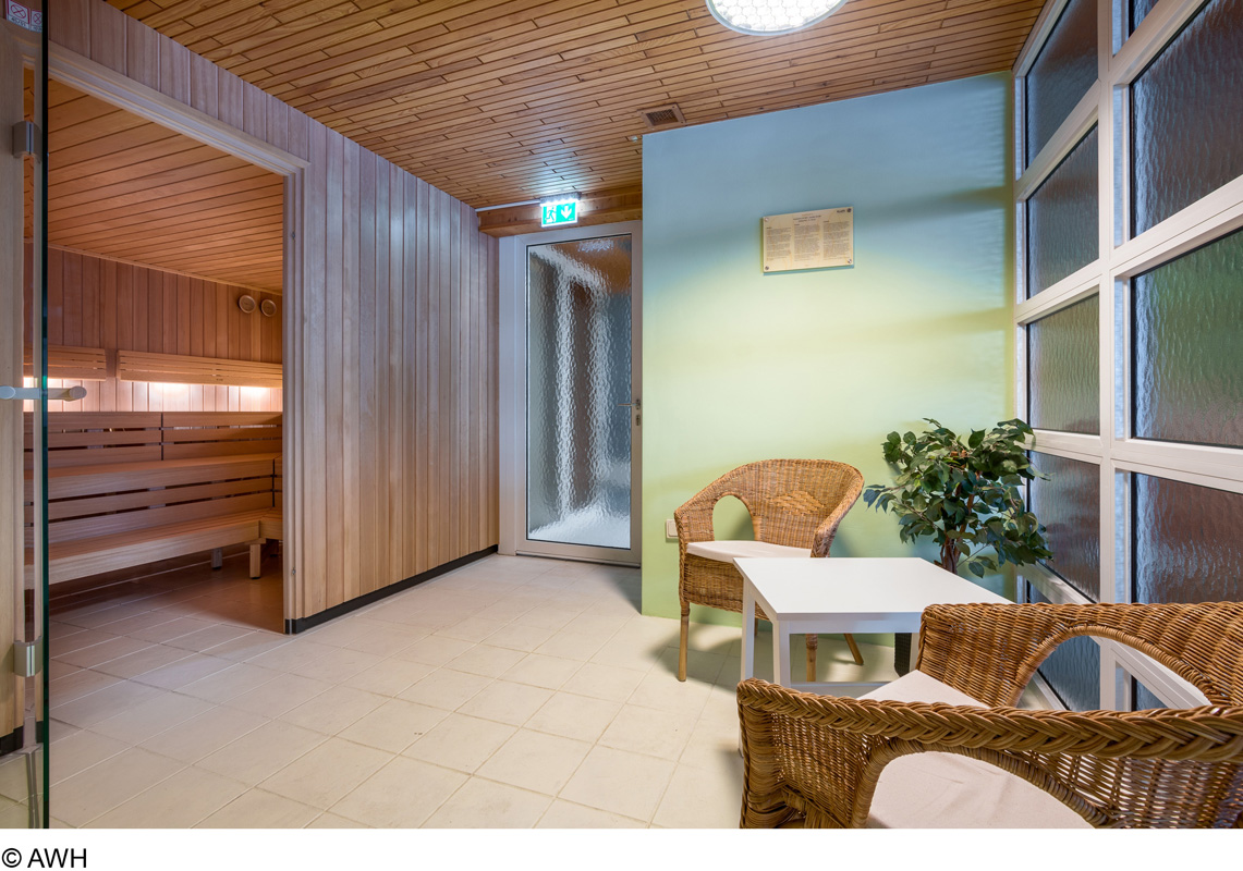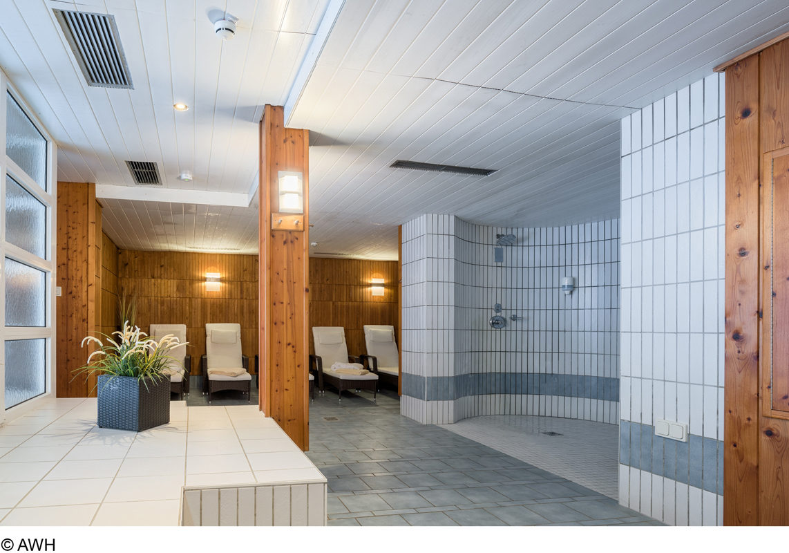 bazén 40 m², finská sauna, pára, Kneippův chodník, infrakabina*, relaxační koutek s lehátky, masáže*
