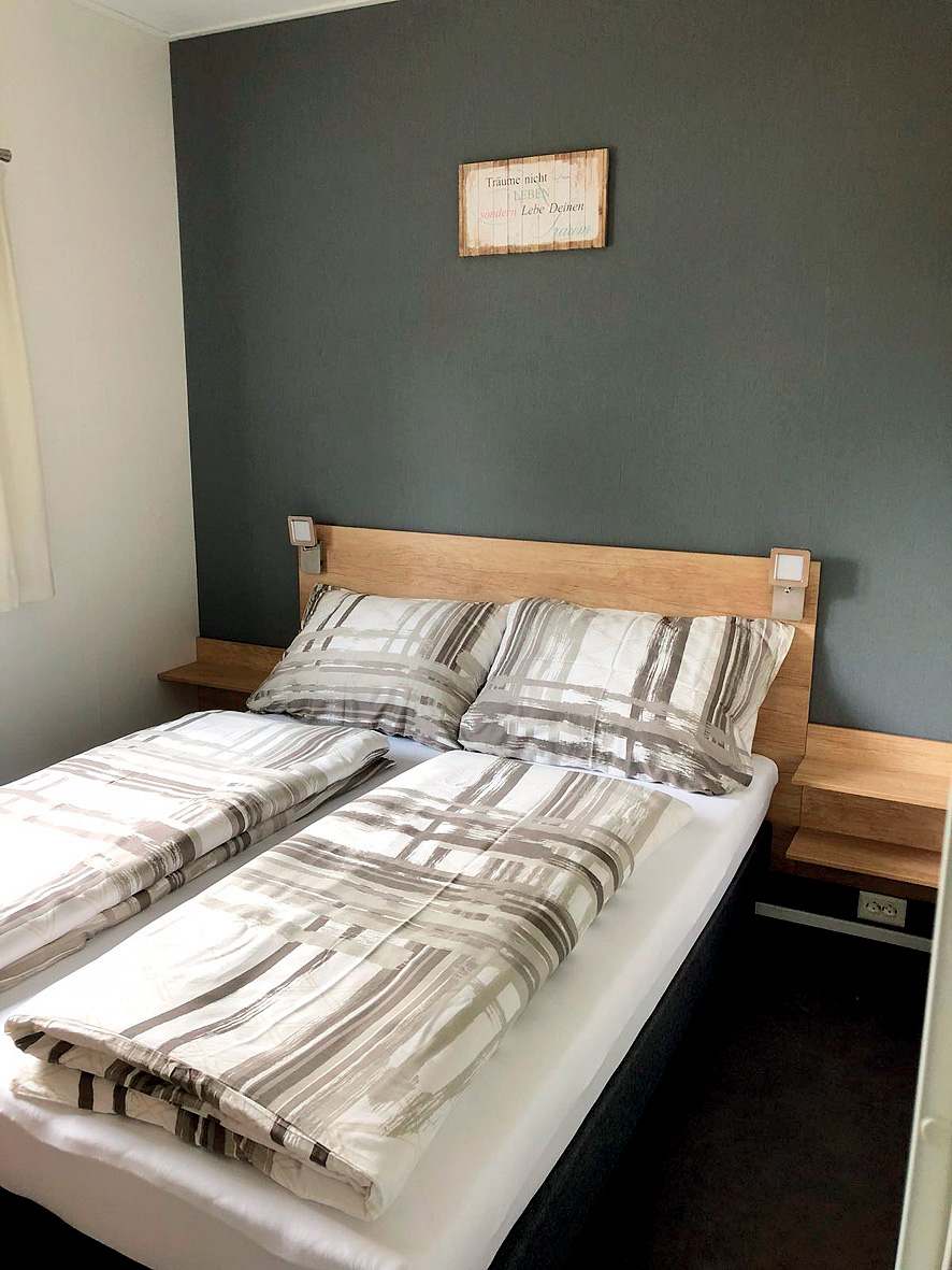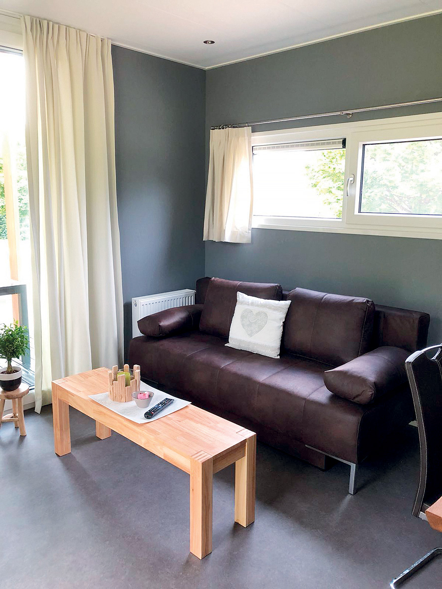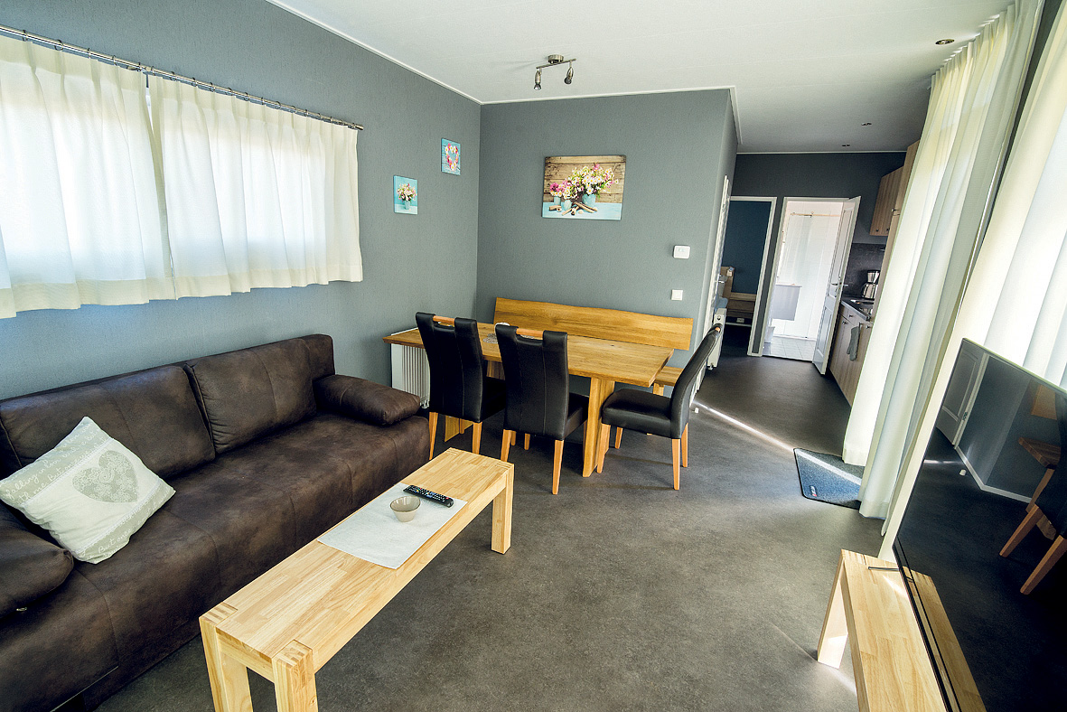 Chalet 2+2 - 45 m² - 1 ložnice s manželskou postelí, ložnice se 2 samostatnými lůžky pro děti do nedovršených 17 let, obývací pokoj s kuchyňským koutem a gaučem, sociální zařízení, terasa