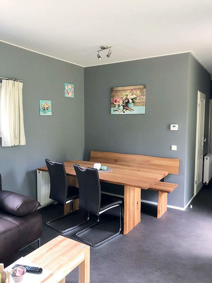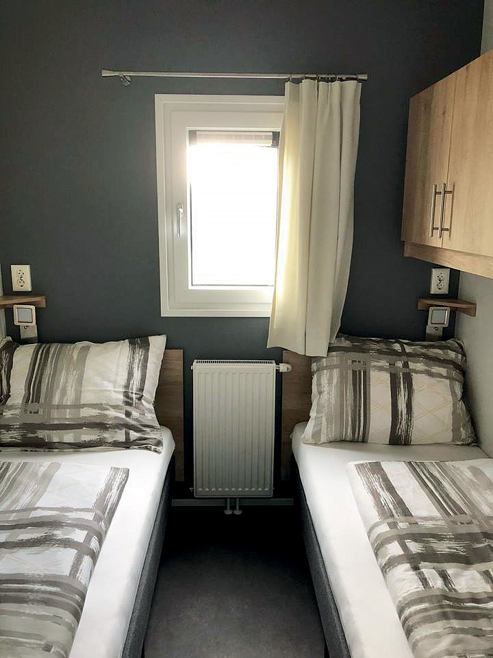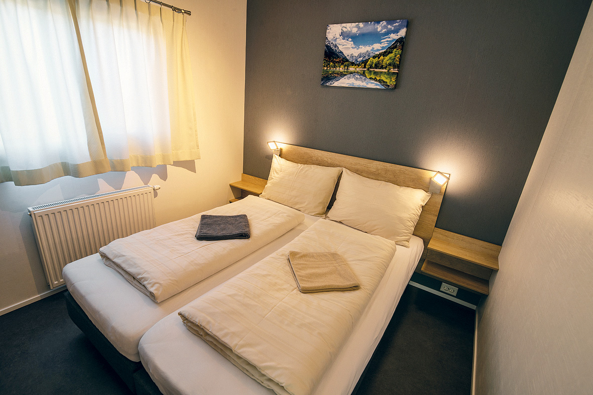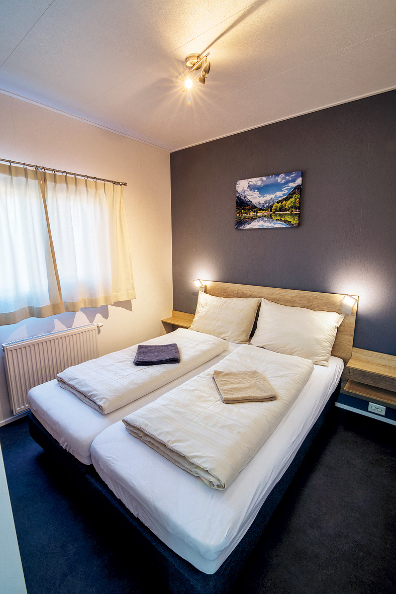 Chalet 2+2 - 45 m² - 1 ložnice s manželskou postelí, ložnice se 2 samostatnými lůžky pro děti do nedovršených 17 let, obývací pokoj s kuchyňským koutem a gaučem, sociální zařízení, terasa