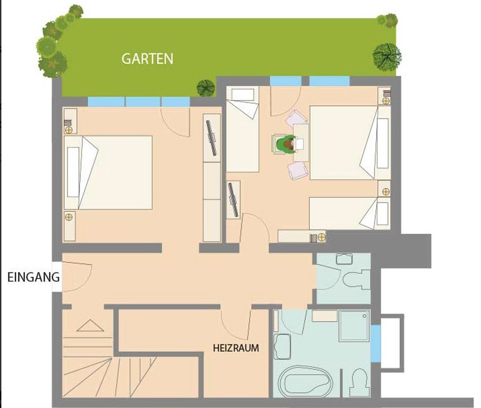 140 m² - 1. podlaží domu: ložnice s manželskou postelí, obývací pokoj s rozkládacím gaučem pro 2 osoby, samostatná kuchyň, sociální zařízení s vanou, terasa; 2.podlaží domu: 1 ložnice s manželskou postelí, ložnice s manželskou postelí a 2 samostatnými lůžky, sociální zařízení, oddělené WC, balkon
