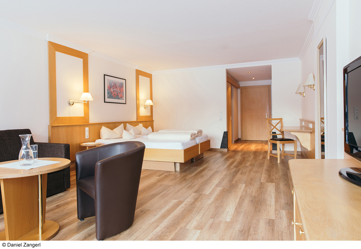 34 m² - pokoj s manželskou postelí a rozkládacím gaučem pro 1 dospělou osobu a 1 dítě do nedovršených 15 let či 2 děti do nedovršených 15 let, sociální zařízení s vanou, balkon či terasa zpravidla s výhledem na hory
