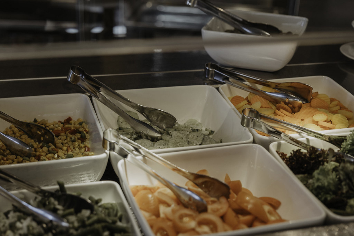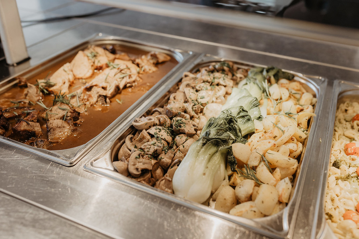 fomrou bufetu, výběr hlavních jídel s přílohou, předkrm či polévka, saláty, dezert, nápoje za poplatek